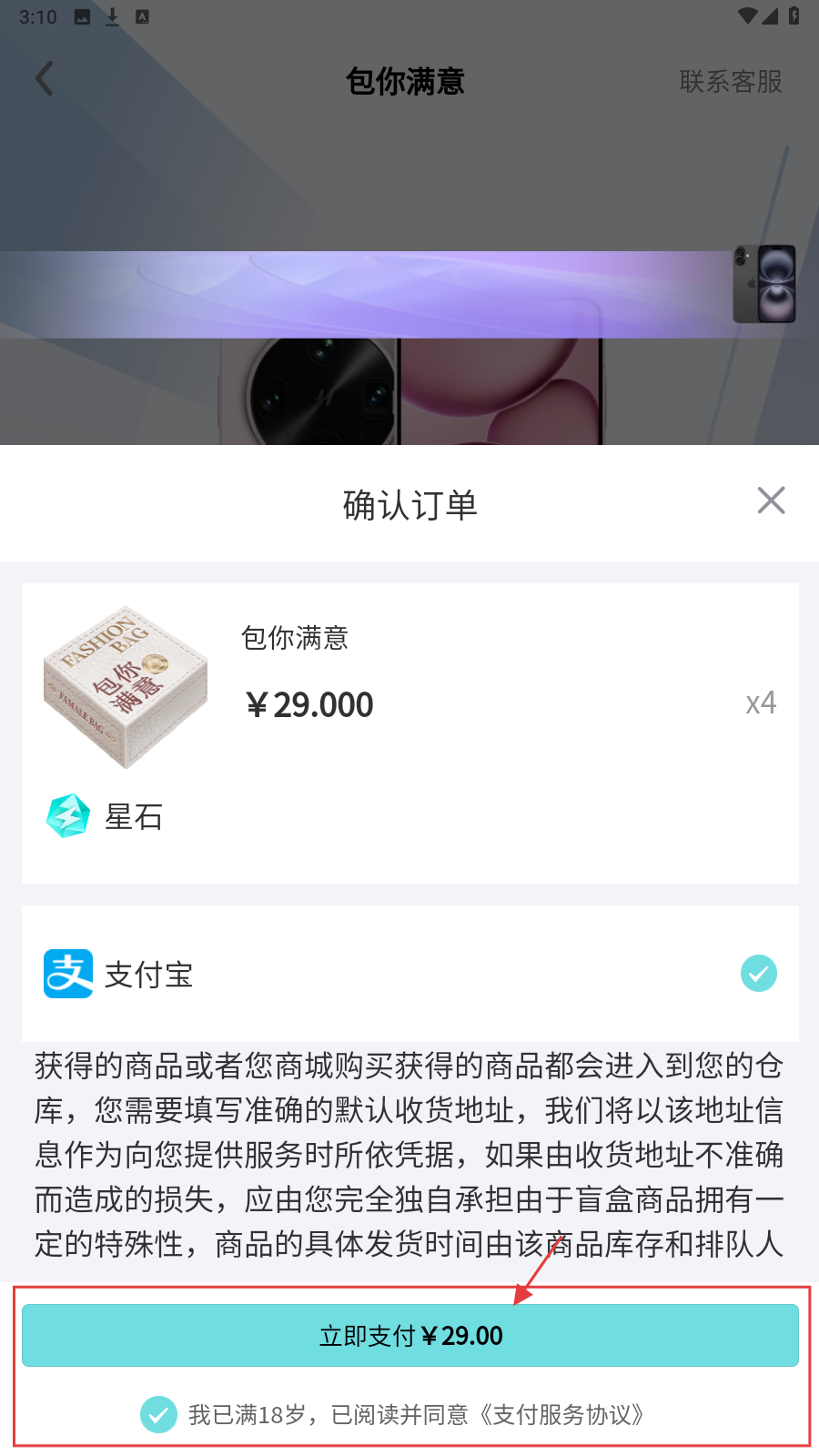 3、确认商品为【包你满意】,核对开盒规则,点【立即开盒】。