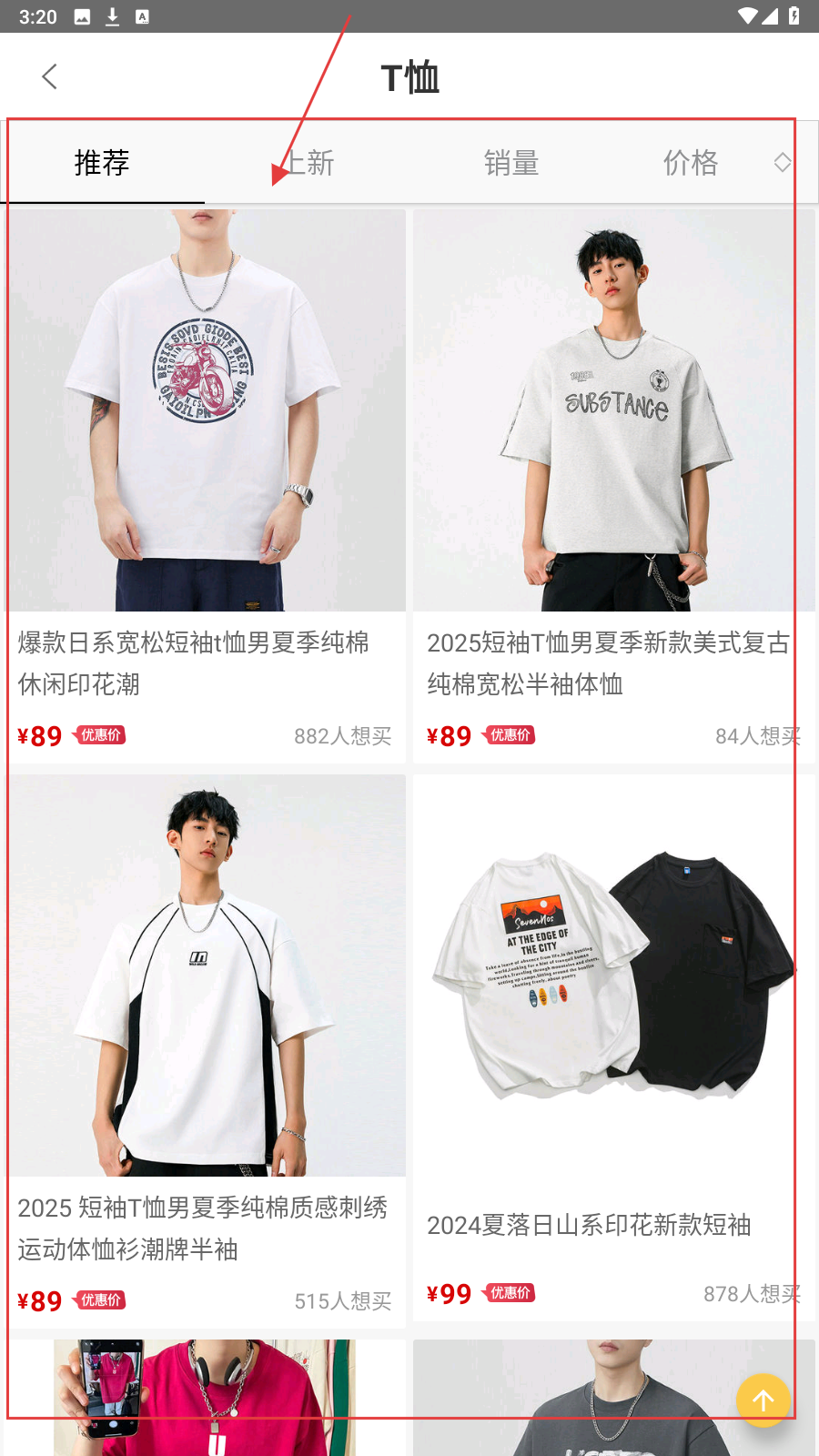 2、在【T恤】页,可按【推荐-上新-销量-价格】筛选项,精准找款式。