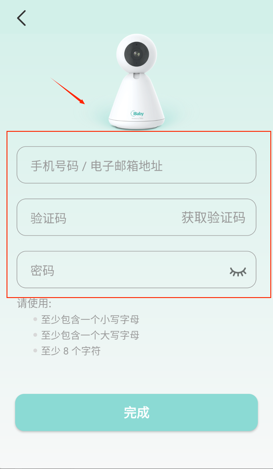 2、设置密码需包含大小写字母且不少于8位,输入完成后点击绿色"完成"按钮提交啦。