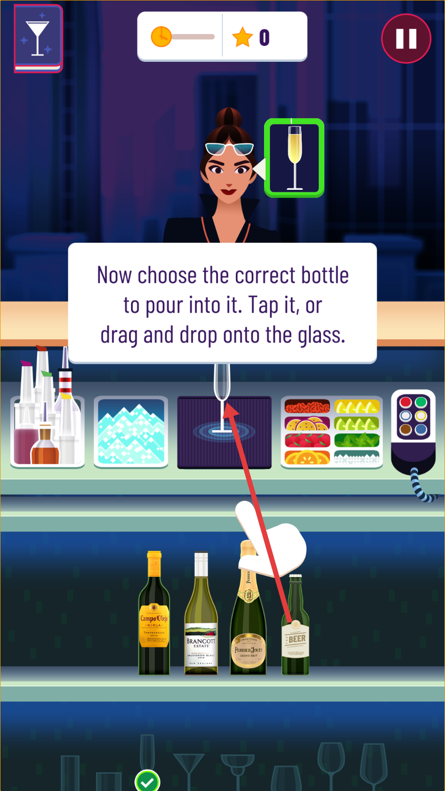 3、根据提示,选择正确酒瓶,通过点击或拖放方式倒酒。