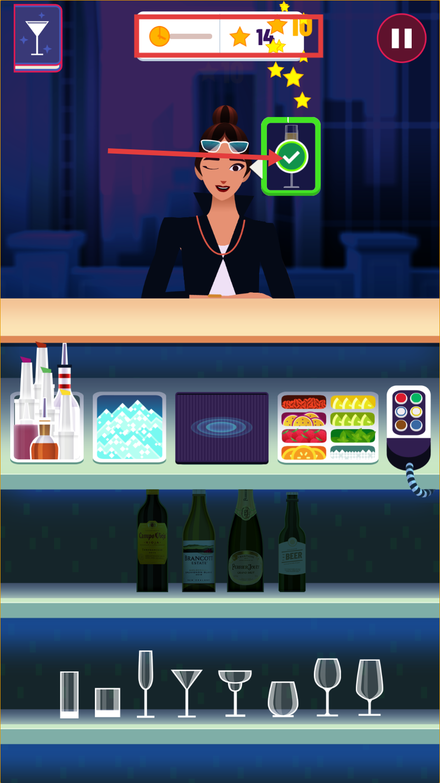 4、成功调酒服务顾客后,会出现绿色对勾,同时获得星星奖励,星星可用于解锁更多内容。
