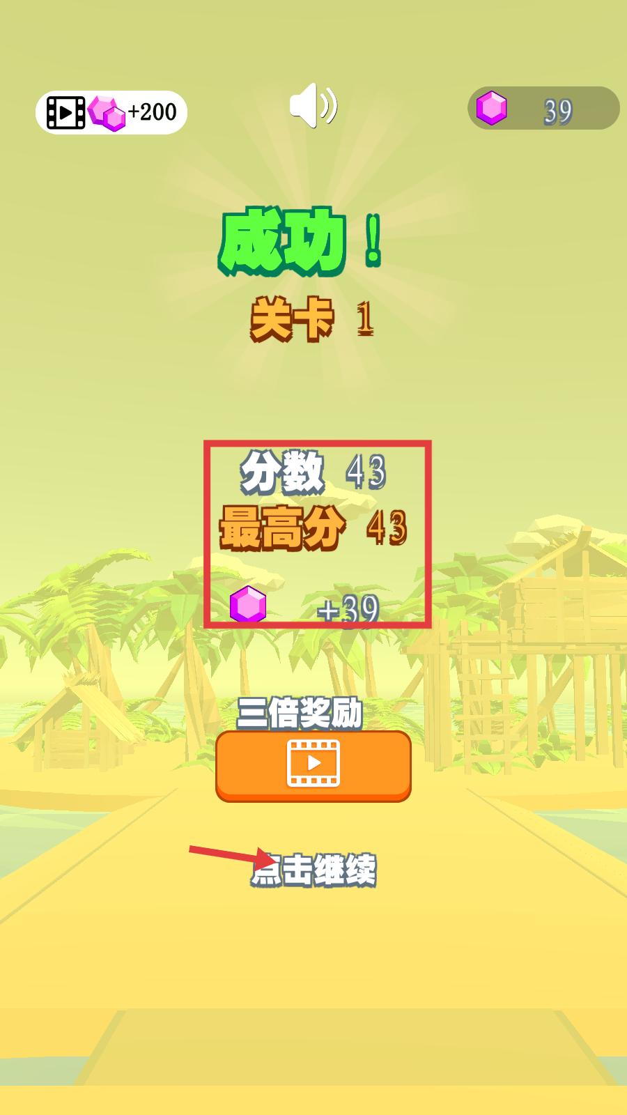 4、关卡结束后,可查看本次分数和最高分,点击【点击继续】可开启下一关挑战。