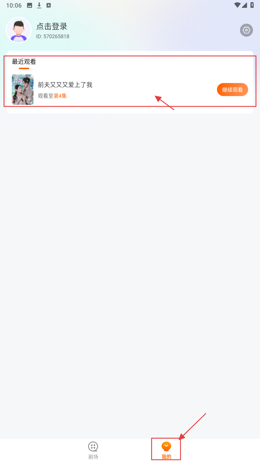 4、进入【我的】页面可以查看【最近观看】,点击【继续观看】即可继续观看未看完的短剧。