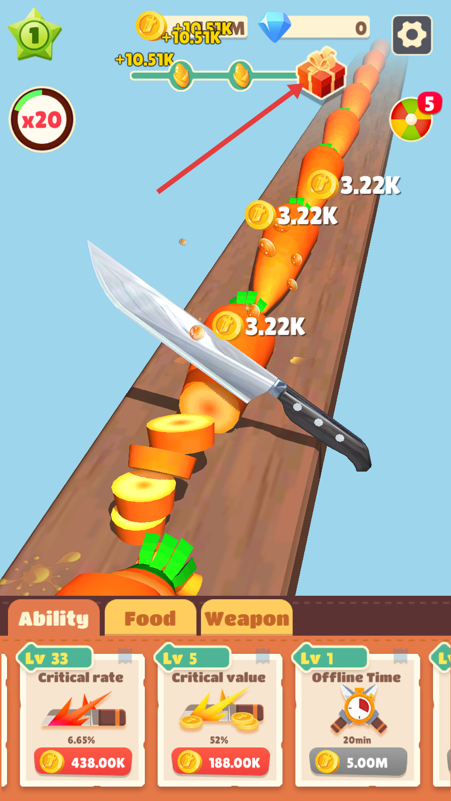 3、可使用金币升级各项能力,如Income(收入)、Criticalrate(暴击率)、Criticalvalue(暴击值)等,提升切割胡萝卜的收益和效果。