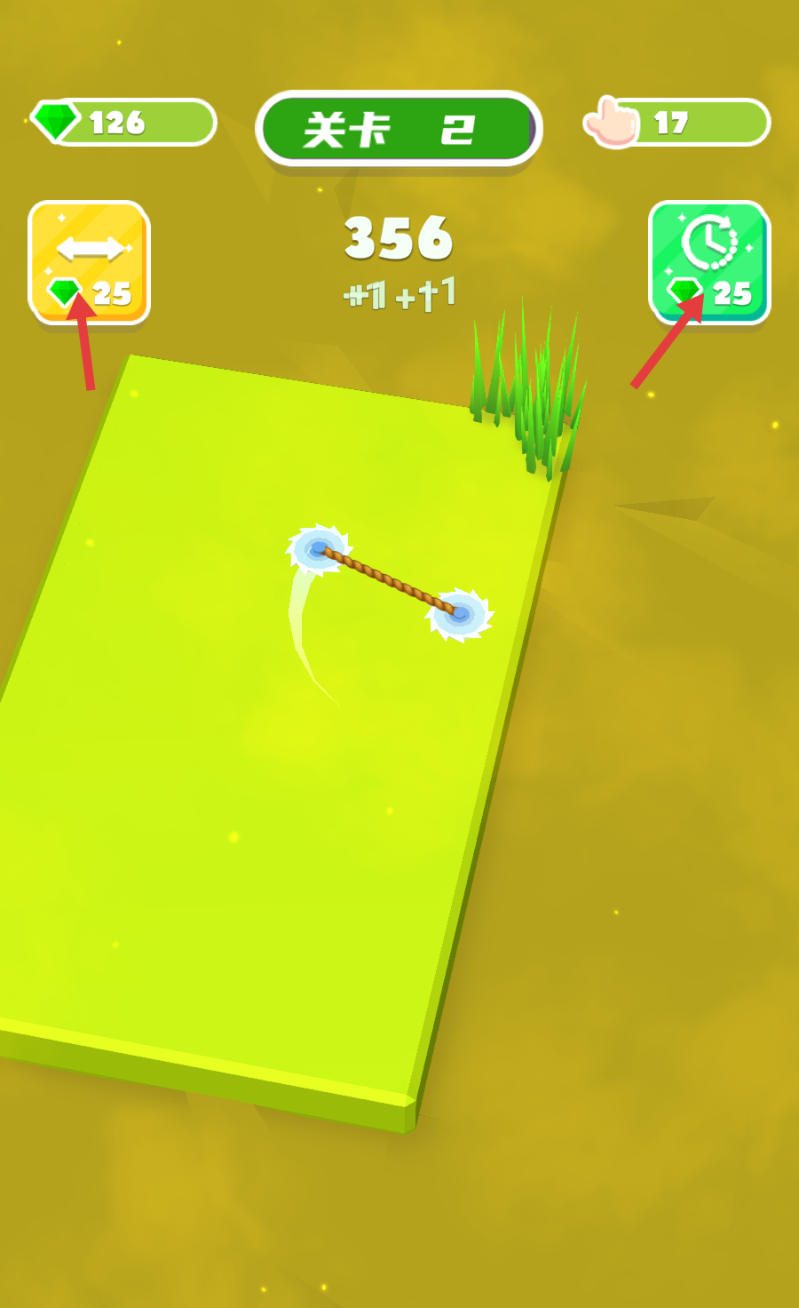3、通过消耗钻石使用左右两侧的功能,一个是加长两个锯齿的绳子,另一个是加强旋转的时间,加快游戏进度。