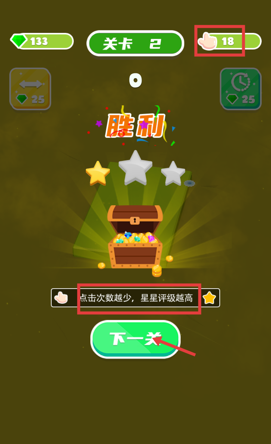 4、关卡结束后,可查看星星评级,点击次数越少,星星评级越高,点击【下一关】可开启下一关挑战。