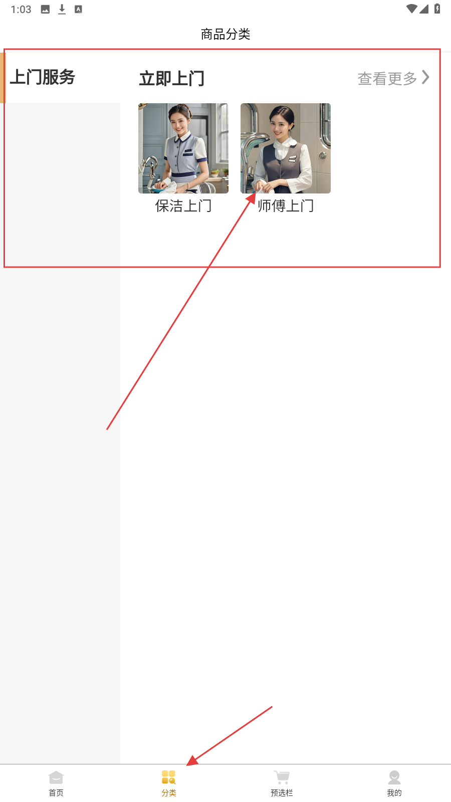 1、进入【分类】页,选【上门服务-师傅上门】,进入服务筛选界面。