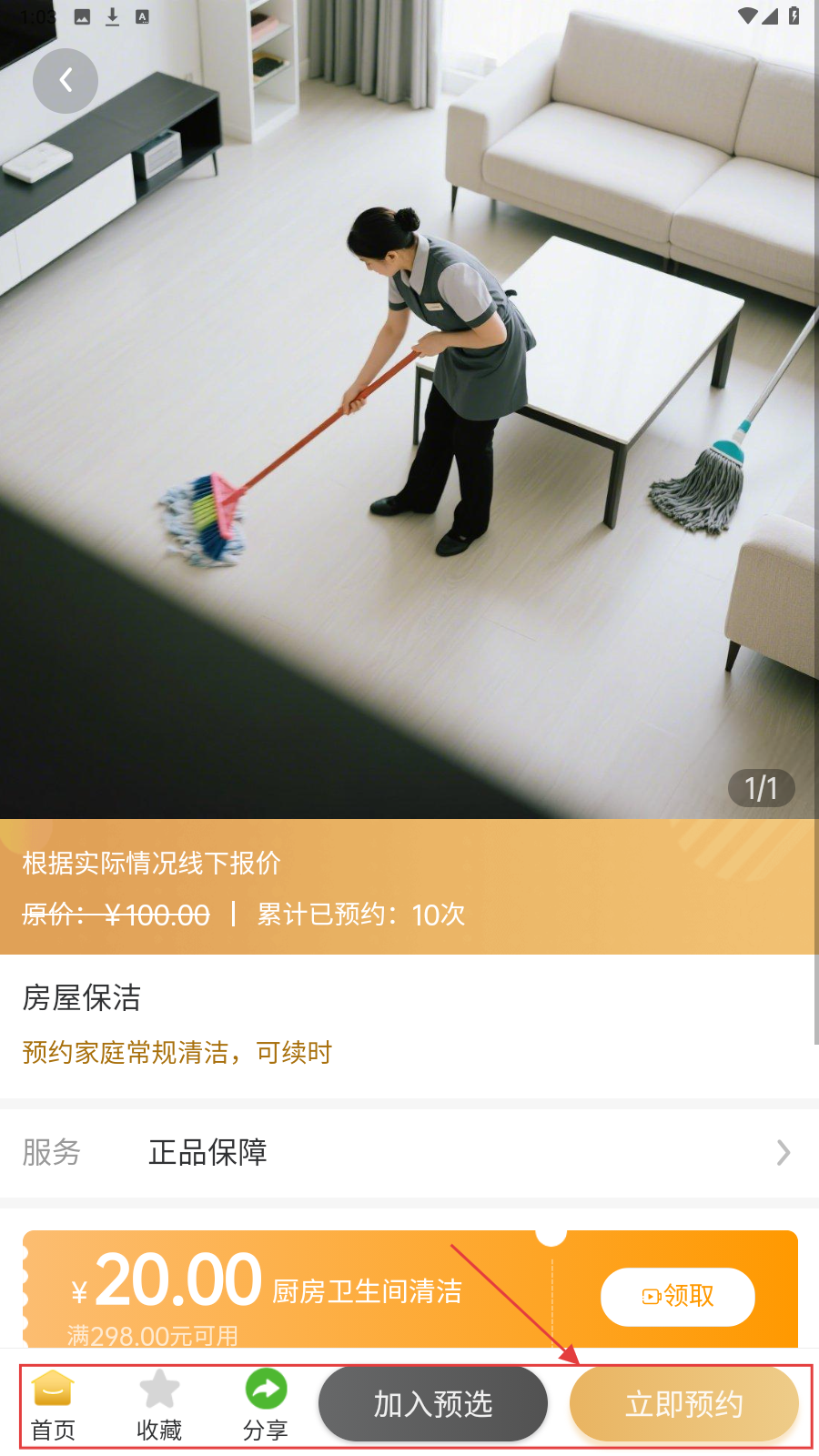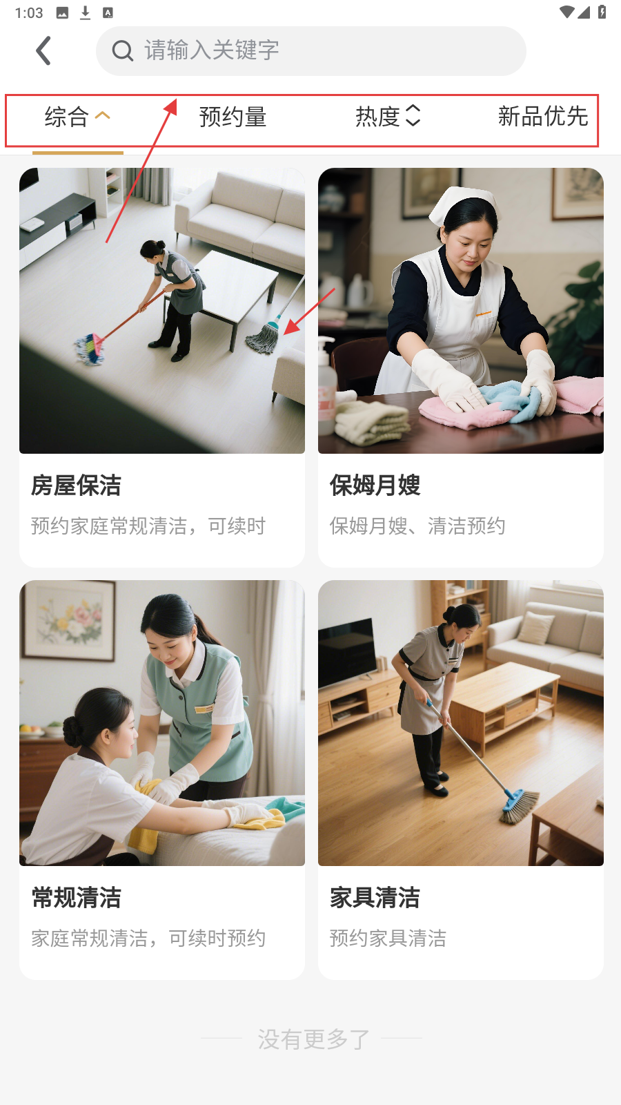 2、在筛选页,用【综合】【预约量】等排序,选【房屋保洁】等服务项。