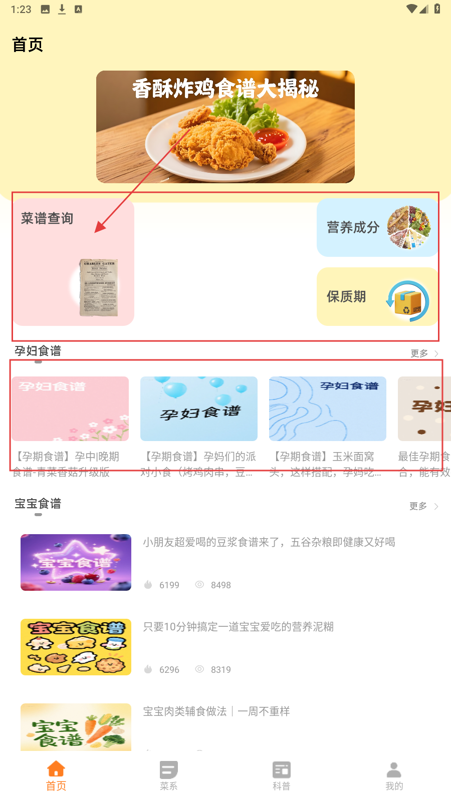 1、想找菜谱先点【菜谱查询】,进入对应页面开启美食探索。