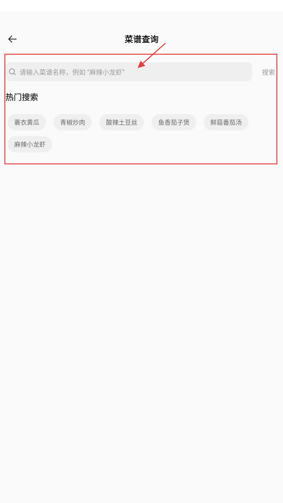 2、在菜谱查询页,可输入菜名或选热门如【蓑衣黄瓜】快速查找。