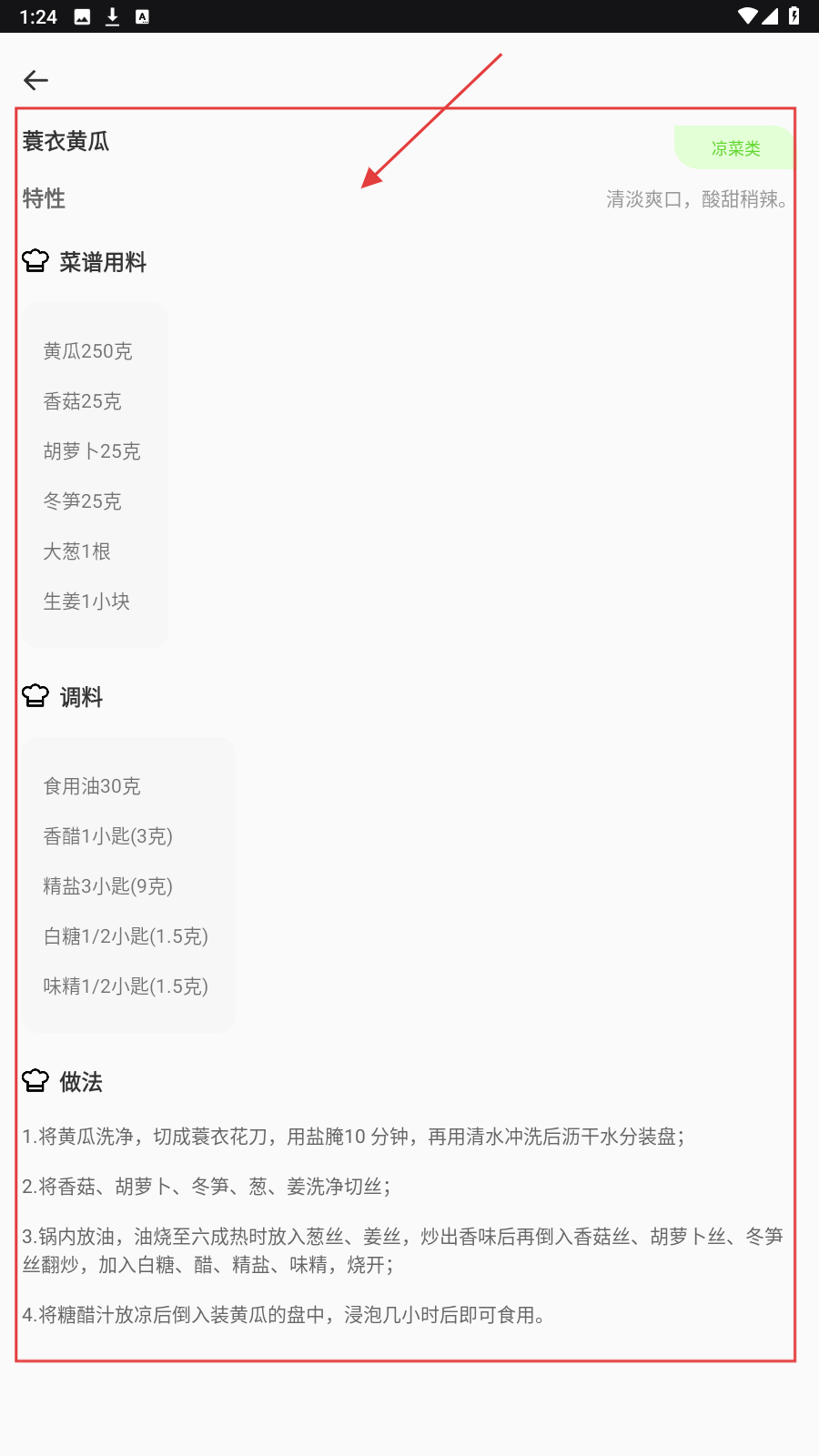4、进入蓑衣黄瓜详情,依据【菜谱用料】【调料】【做法】实操做菜。