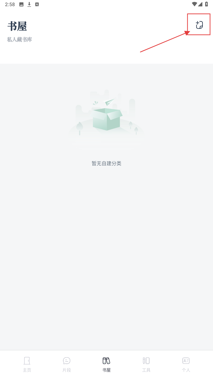 3、进入【书屋】,点右上角按钮,跳转【新建分类】页。