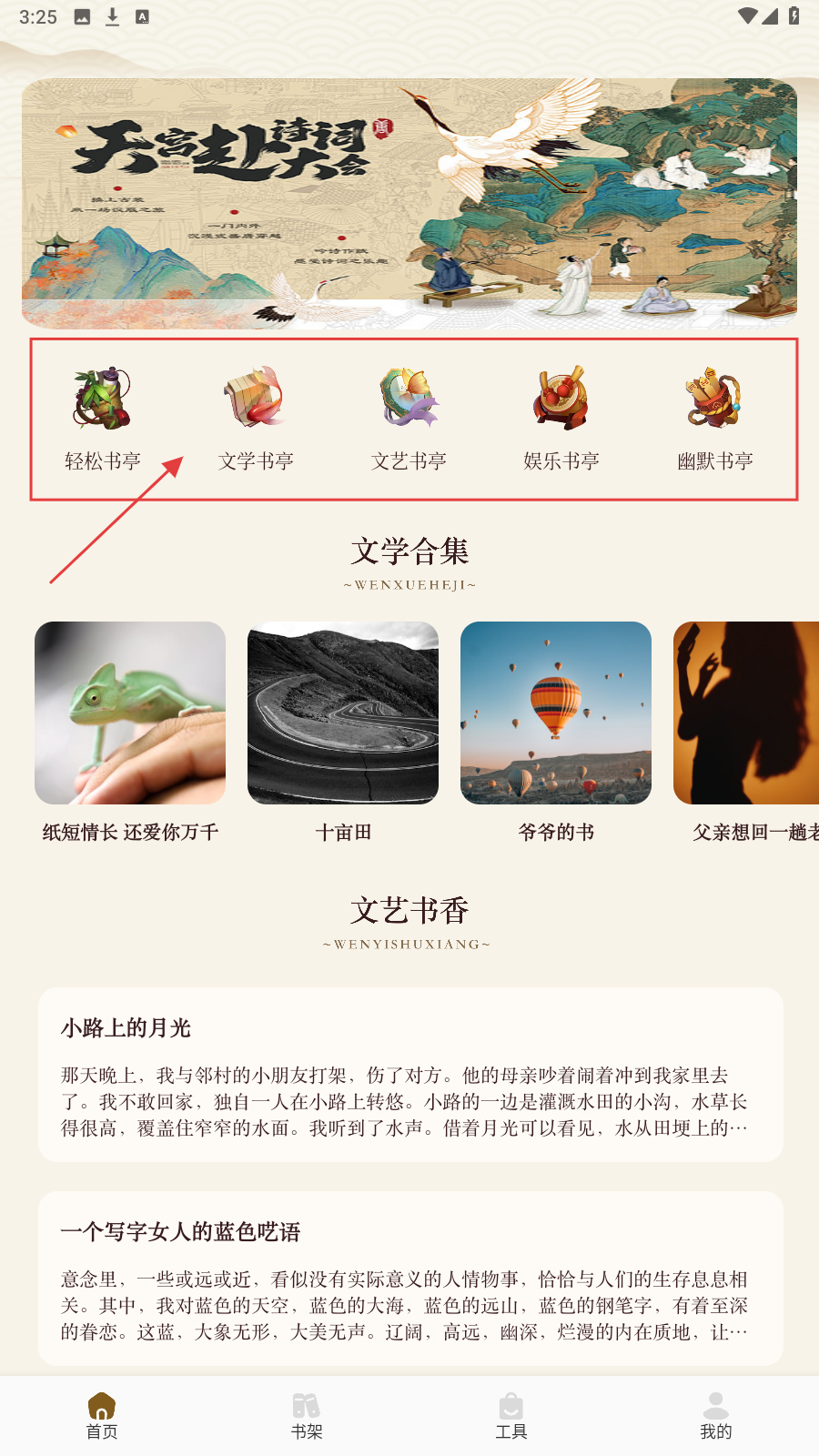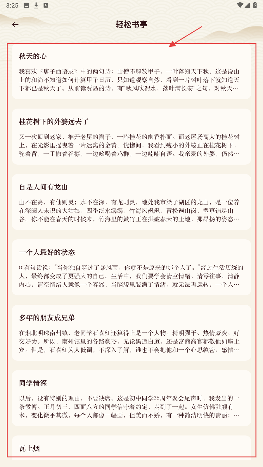 1、首页选【轻松书亭】分类,进入浏览文章列表。