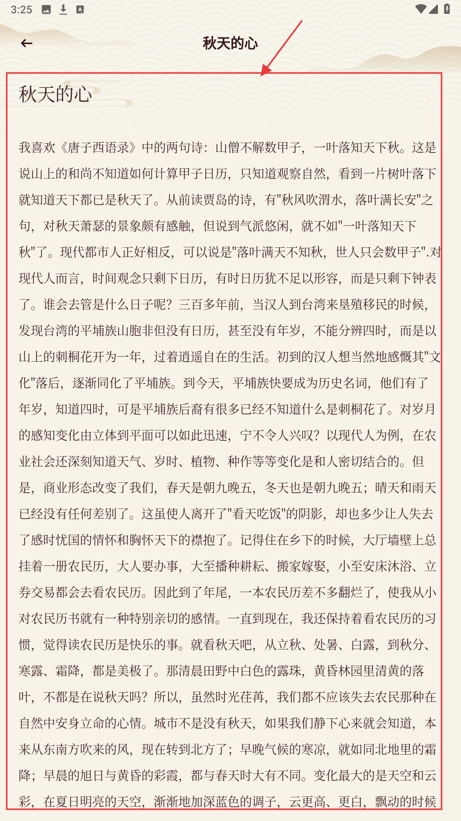 2、在轻松书亭,点《秋天的心》等文章标题,阅读全文内容。