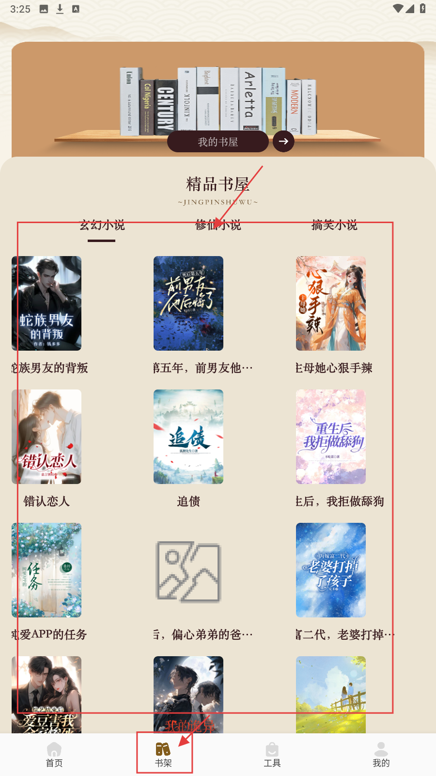 4、点【书架】,选【修仙小说】等分类,查找想读小说。
