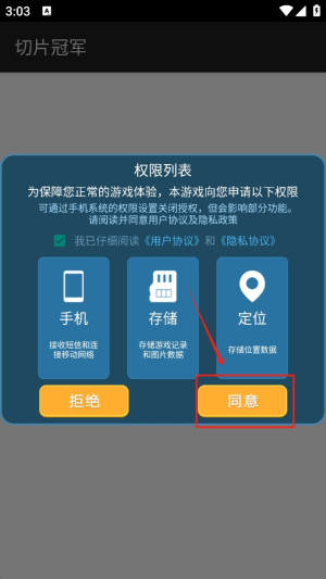 1、首先,同意游戏的权限请求,包括手机、存储和定位权限,以确保游戏正常运行。