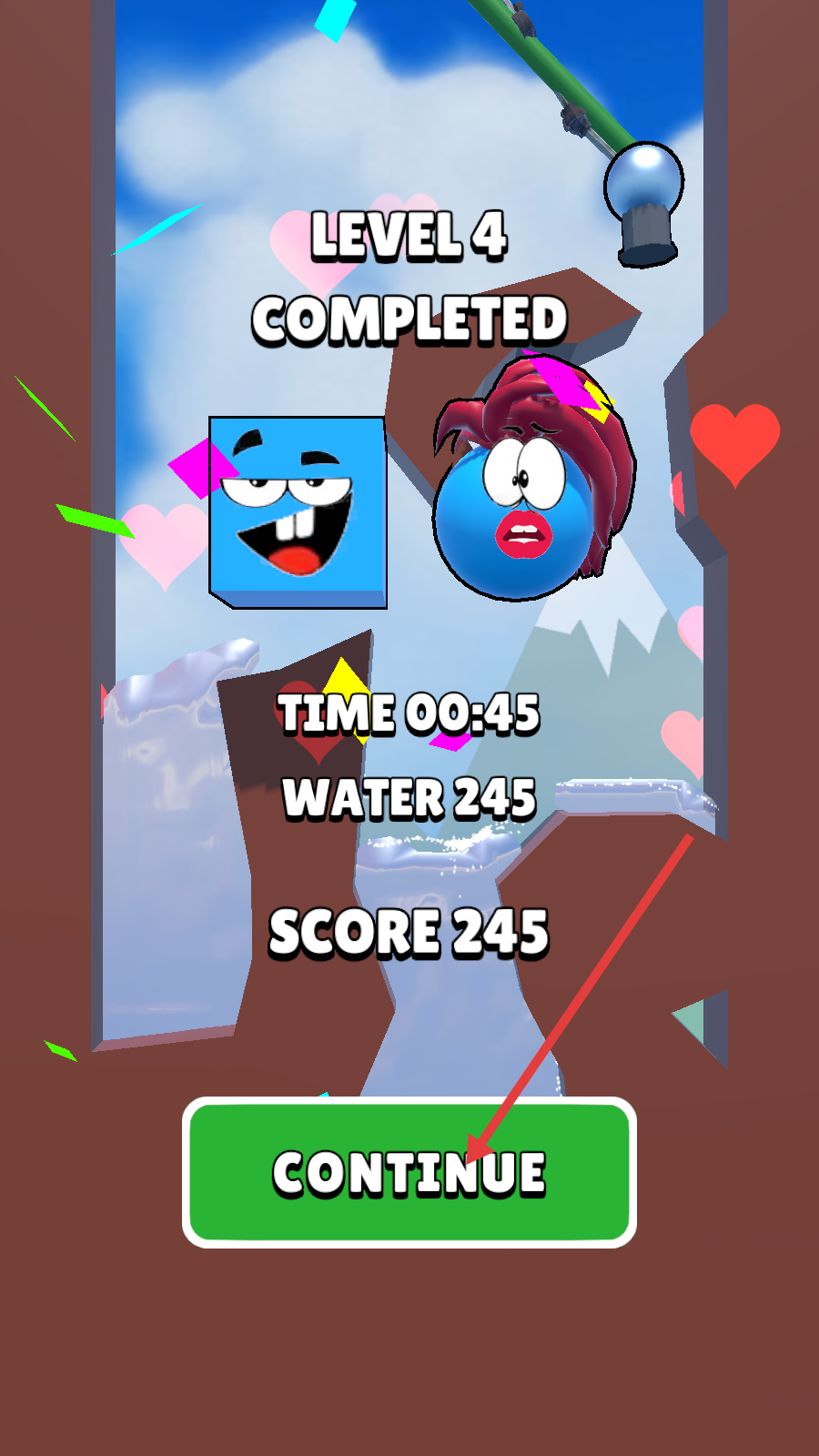 4、关卡完成后,可查看获得的分数和完成时间,点击“CONTINUE”继续挑战下一个关卡。