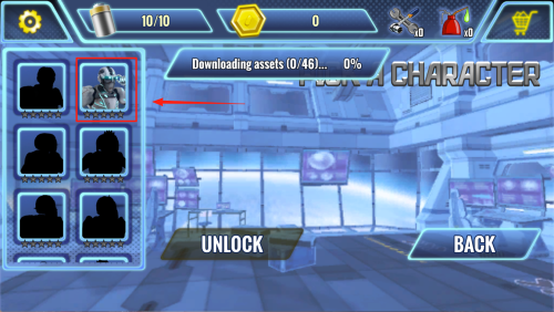 3、若想更换角色,在下载界面点击“CHARACTER”,浏览并选择喜欢的解锁角色,再点“BACK”返回。