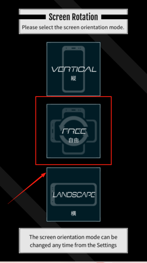 2、根据提示选择屏幕方向,点击“横”即“LANDSCAPE”锁定横屏模式,或选“自由”随时切换。