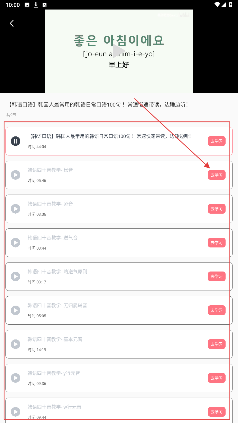 2、进入问候语学习界面,在下方可以选择要学习的章节,点击【去学习】。