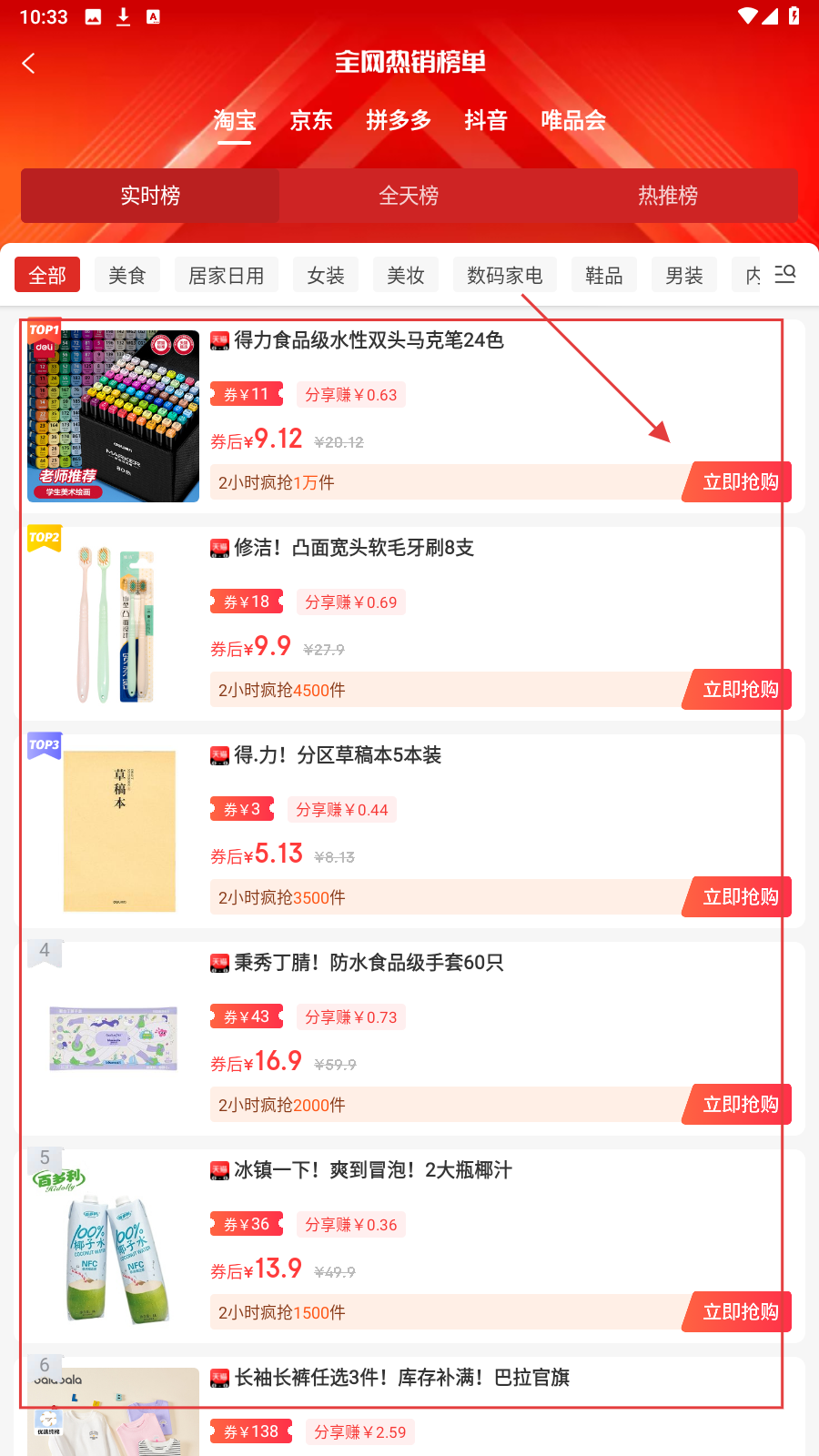 2、进入【全国热销榜单】页面,选择心仪商品并点击【立即抢购】。