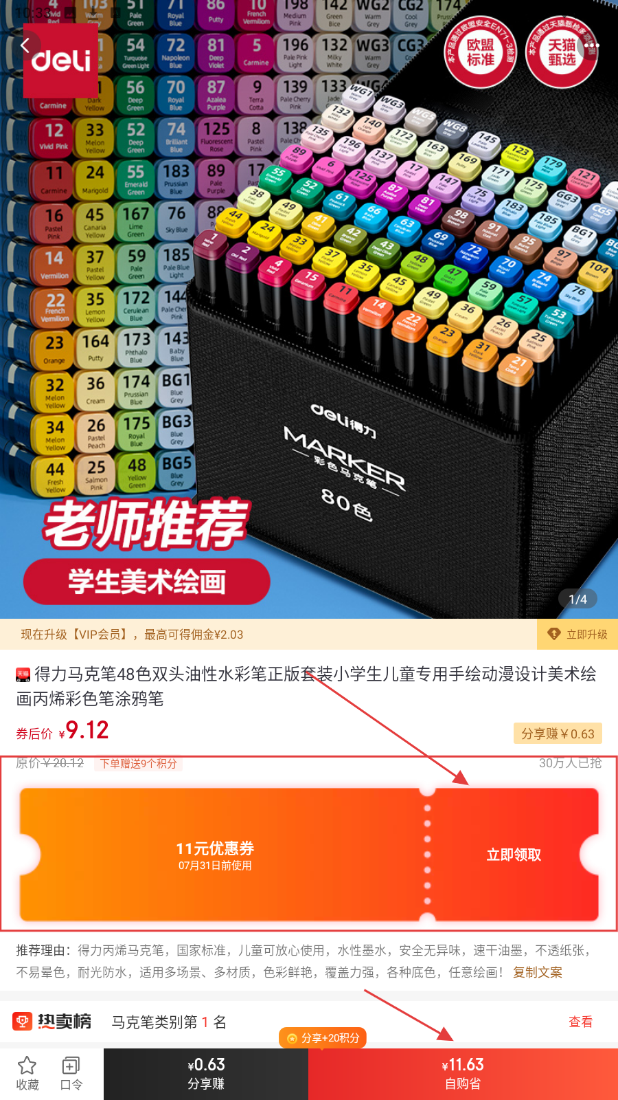 3、在商品购买页,点击【立即领取】领取优惠券后点击下方【自购省】即可购买。