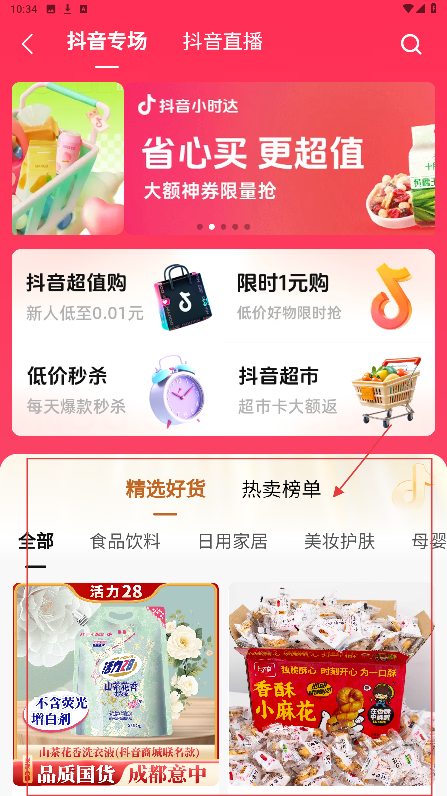 4、还可以切换到【抖音专场】等页面,查看更多优惠商品。