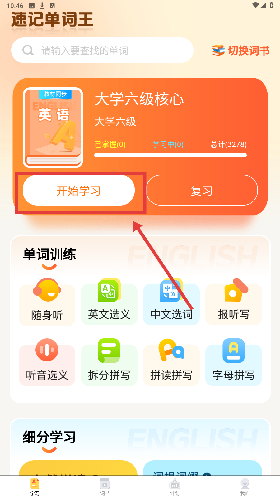1、打开【速记单词王】应用,在【学习】页面点击【开始学习】按钮。