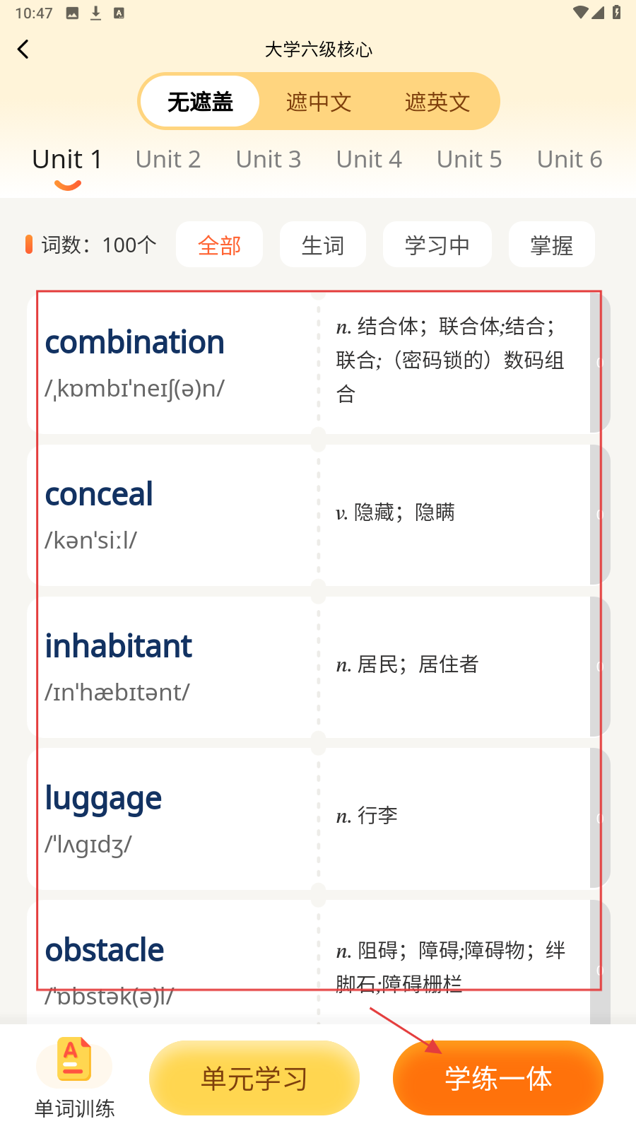 2、在【大学六级核心】页面,点击【学练一体】开始单词学习。