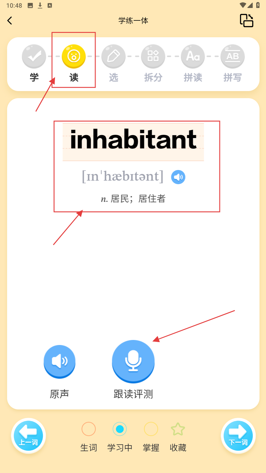 4、点击【读】,听系统教学发音,点击下方麦克风进行跟读练习口语。