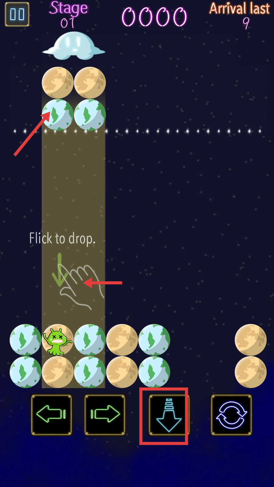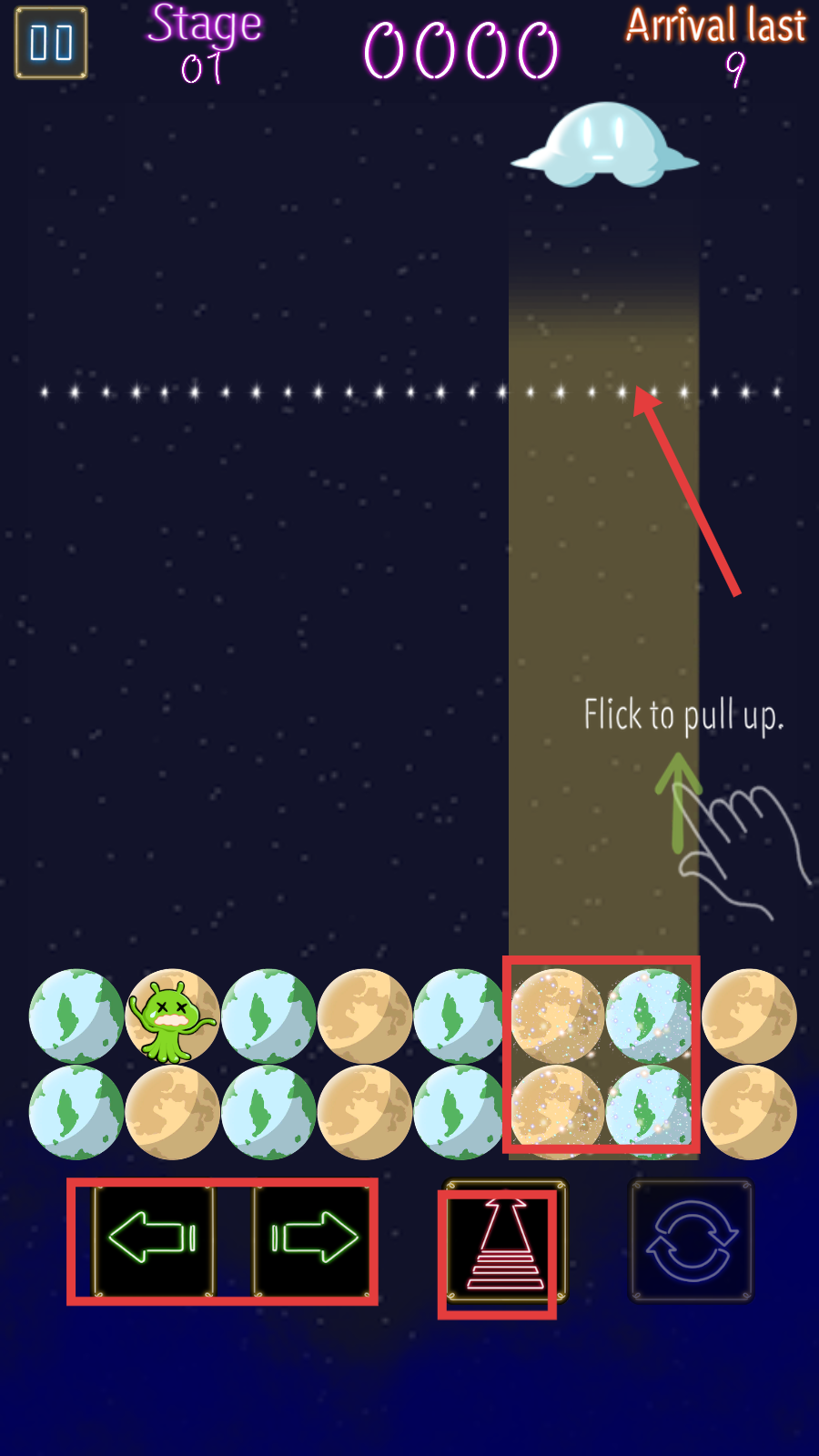 3、到达指定位置后,点击向下按钮,让角色向下发射星球,按三消的机制消除下方的星球,解放外星人。