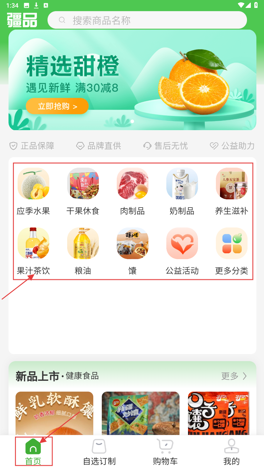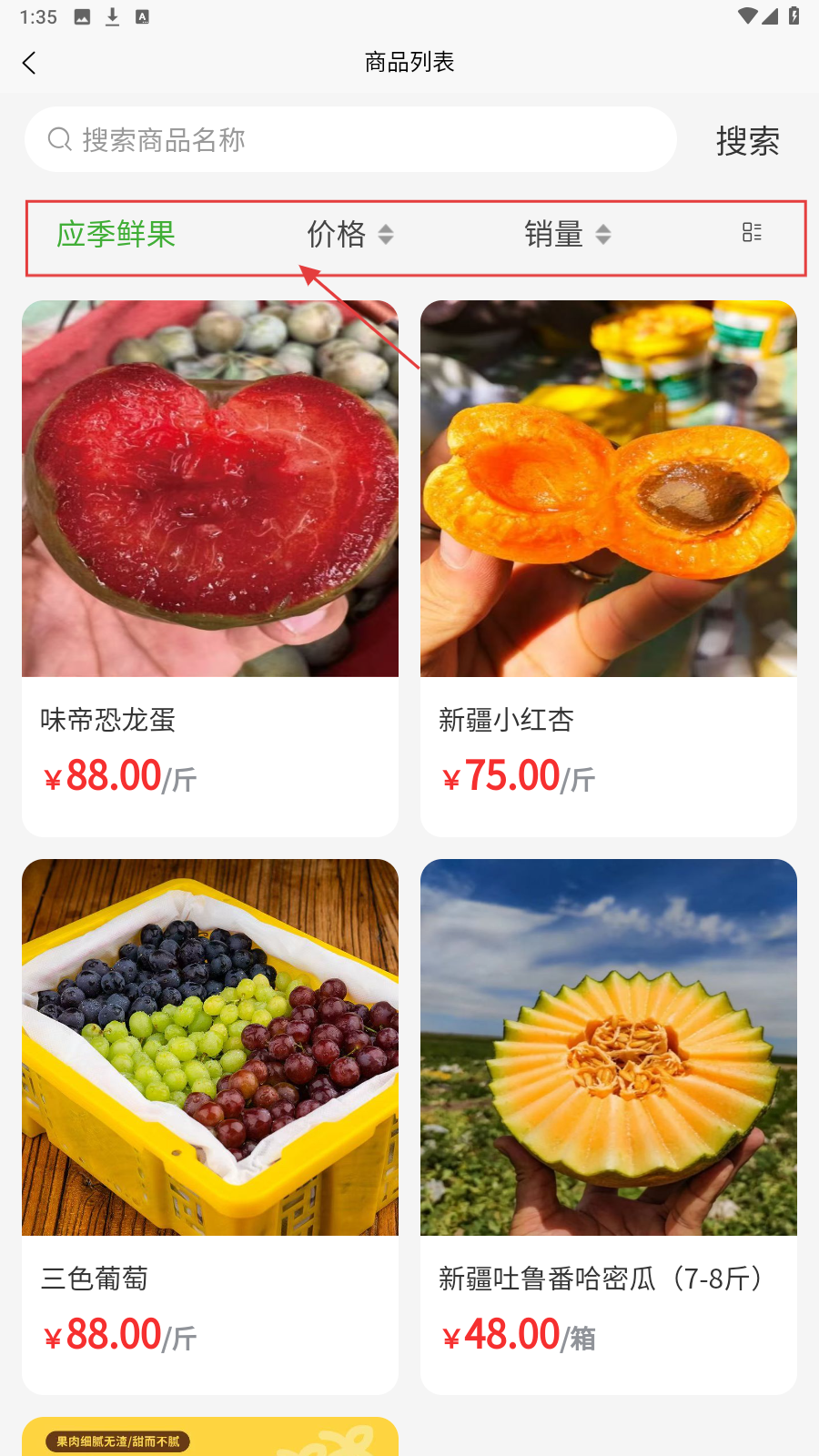 1、打开APP【首页】,选分类(如应季水果),进入商品列表页。