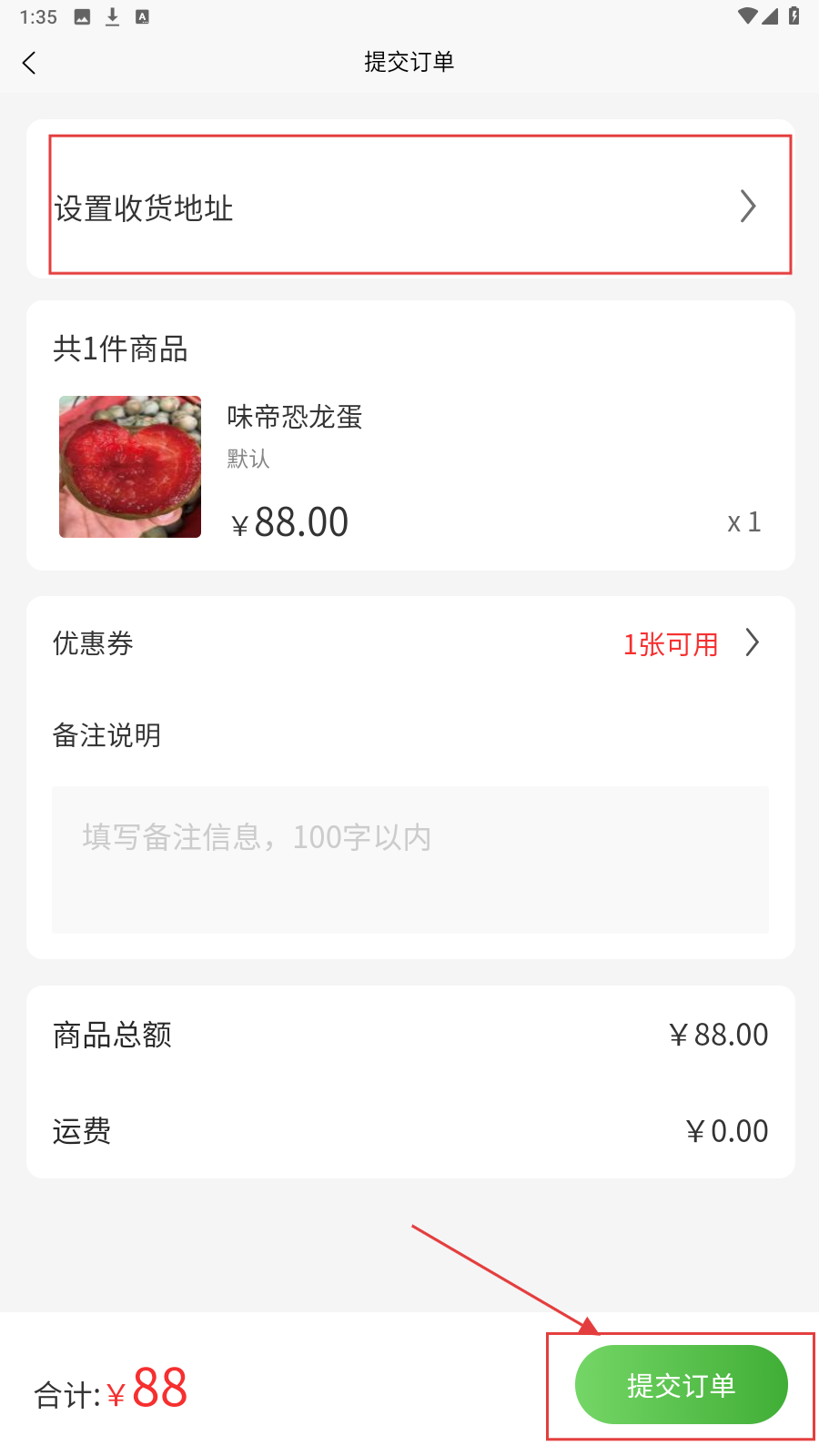 4、提交订单页设收货地址,核对金额,点【提交订单】完成购买。