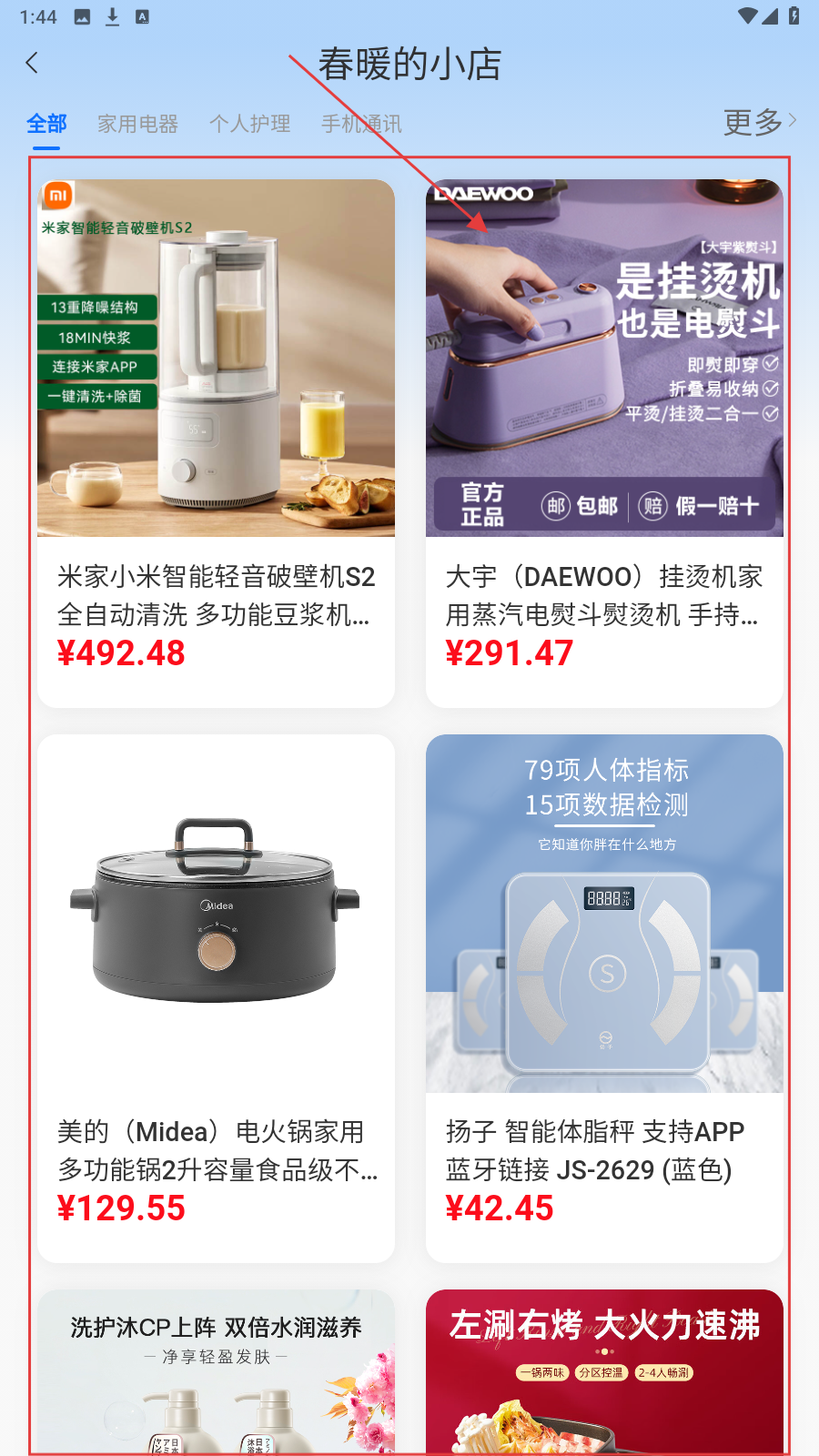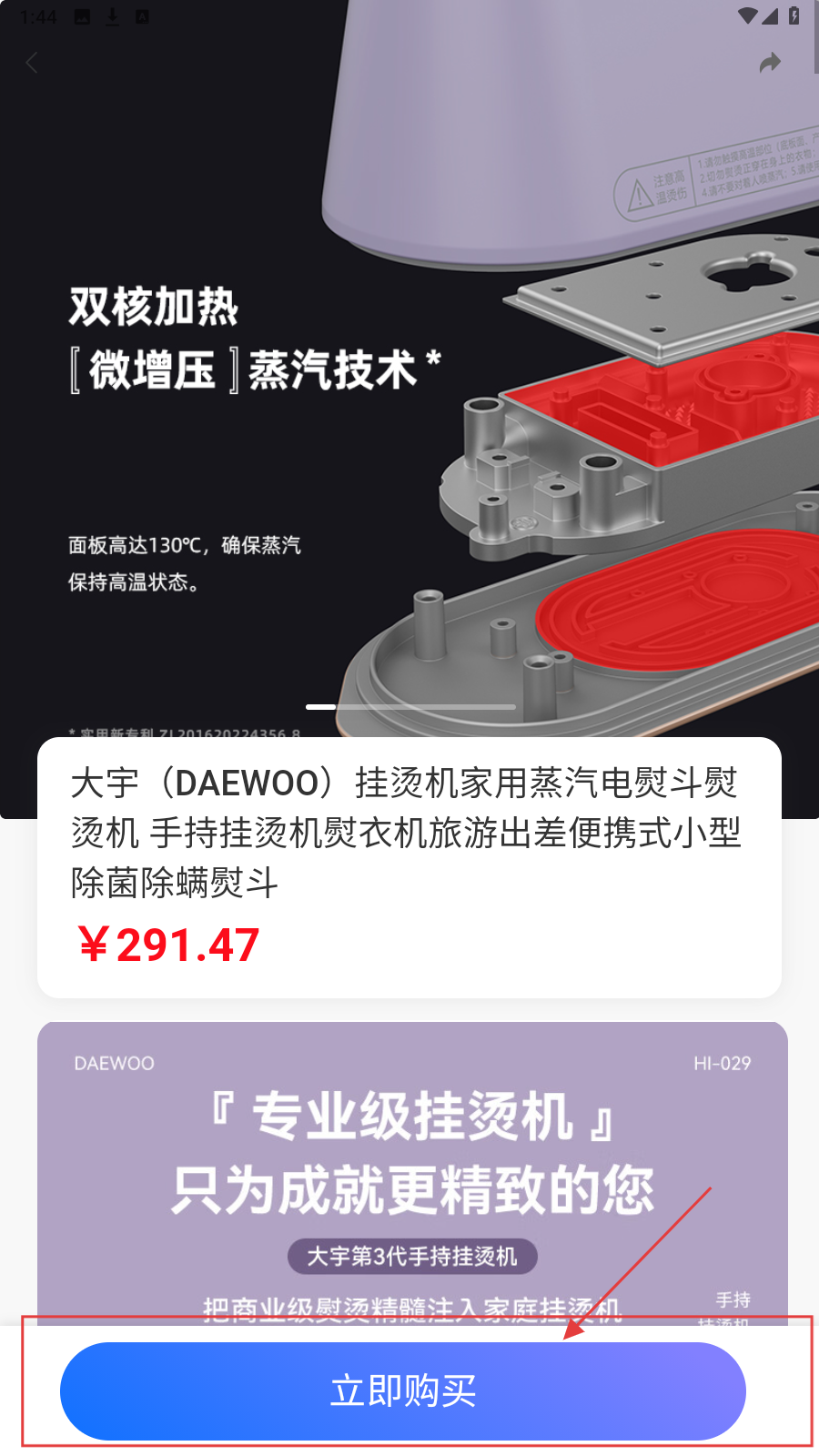 2、在店铺商品列表,找到目标商品(如大宇挂烫机),进入详情页。