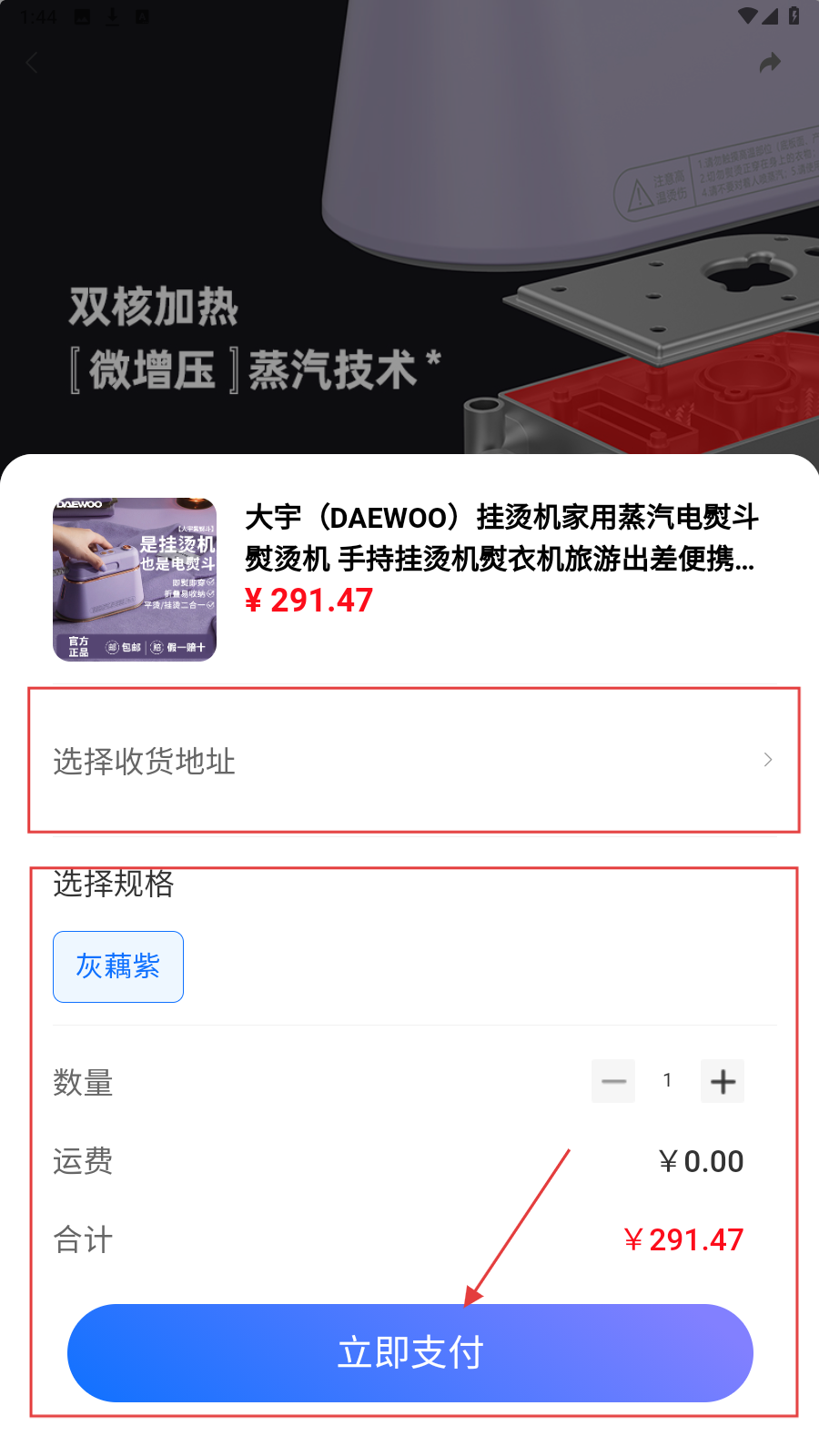 4、订单页选收货地址、规格,点【立即支付】,完成购物流程。