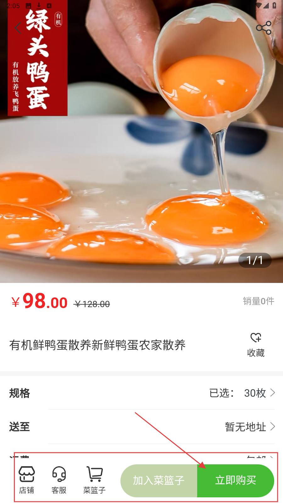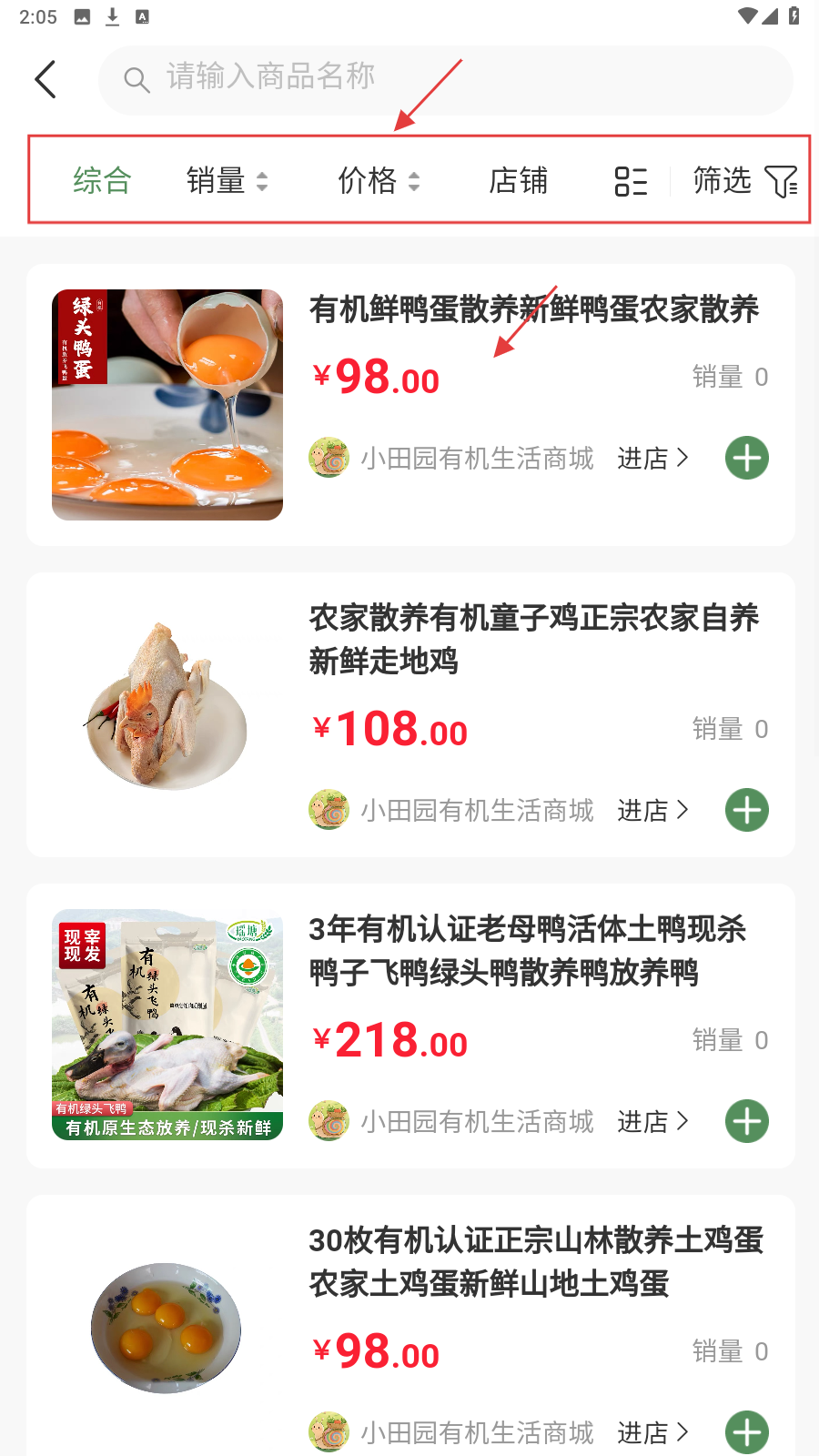 2、商品列表页,用综合/销量等排序,找到心仪商品(如有机鲜鸭蛋)。