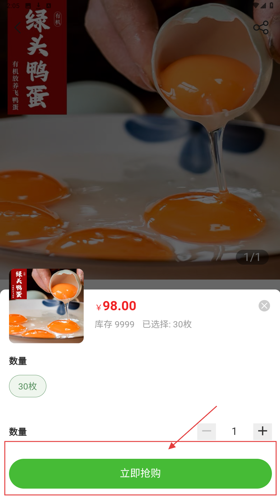 4、选商品数量(如30枚),点击【立即抢购】,完成购买流程。