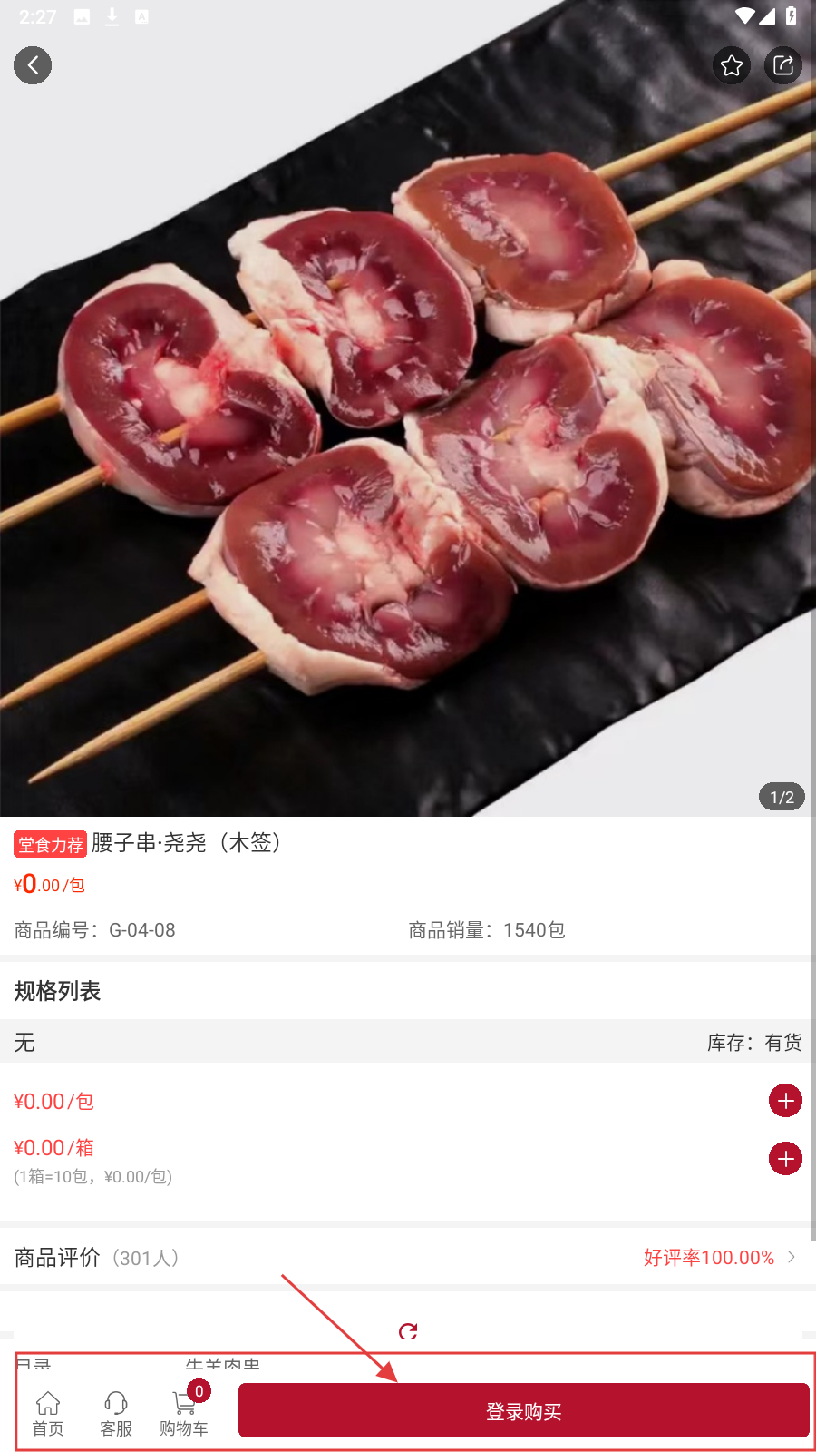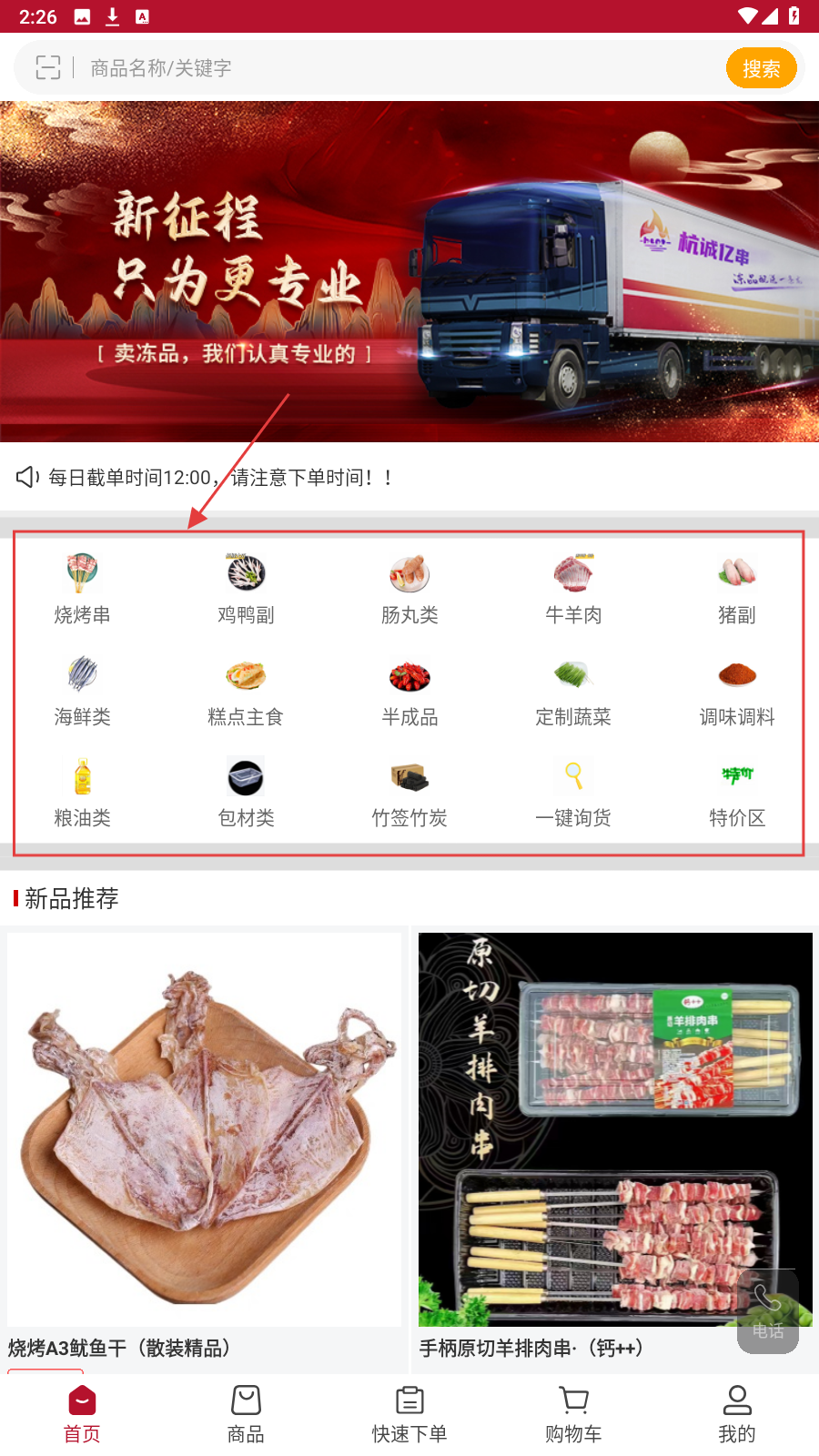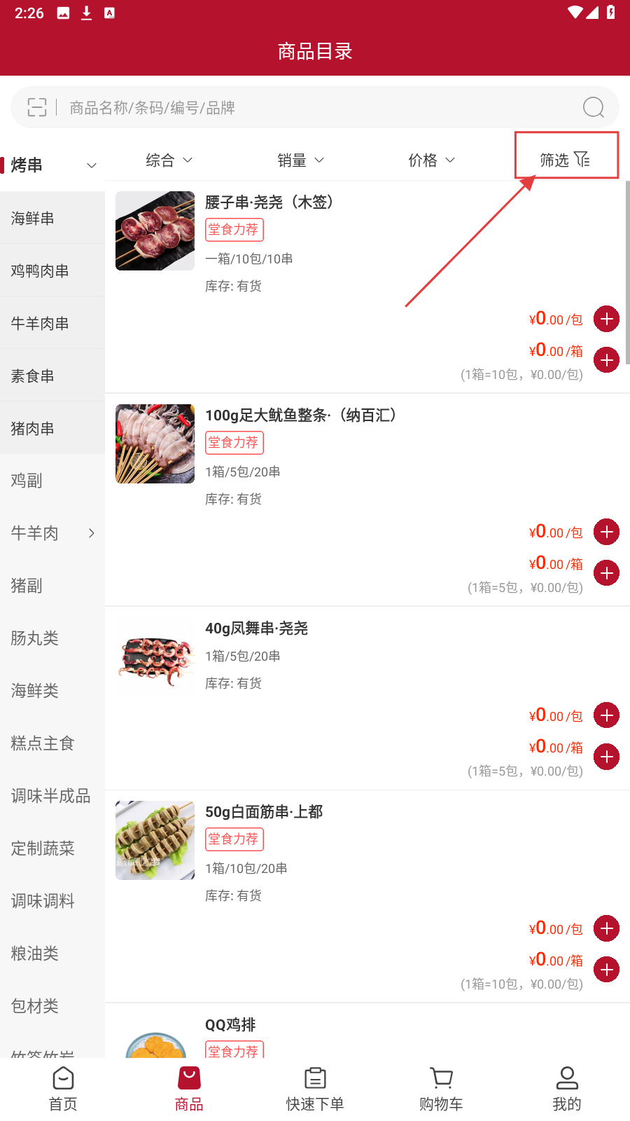 1、进入APP首页,点击分类(如【烧烤串】),进入商品目录页。