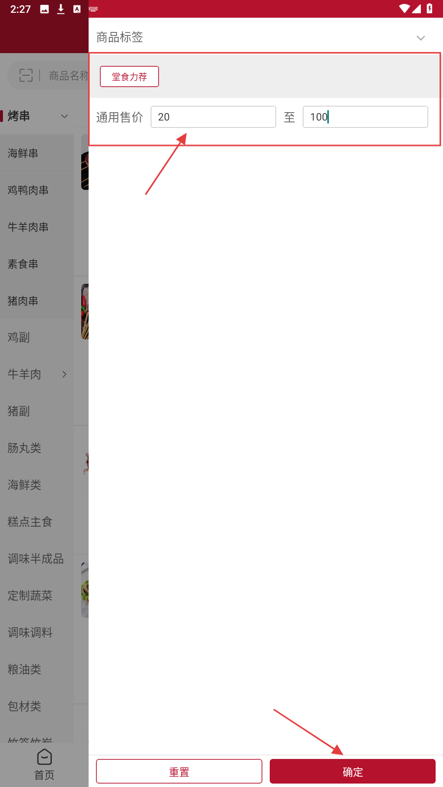 3、选【堂食力荐】标签,填售价区间,点击【确定】筛选商品。