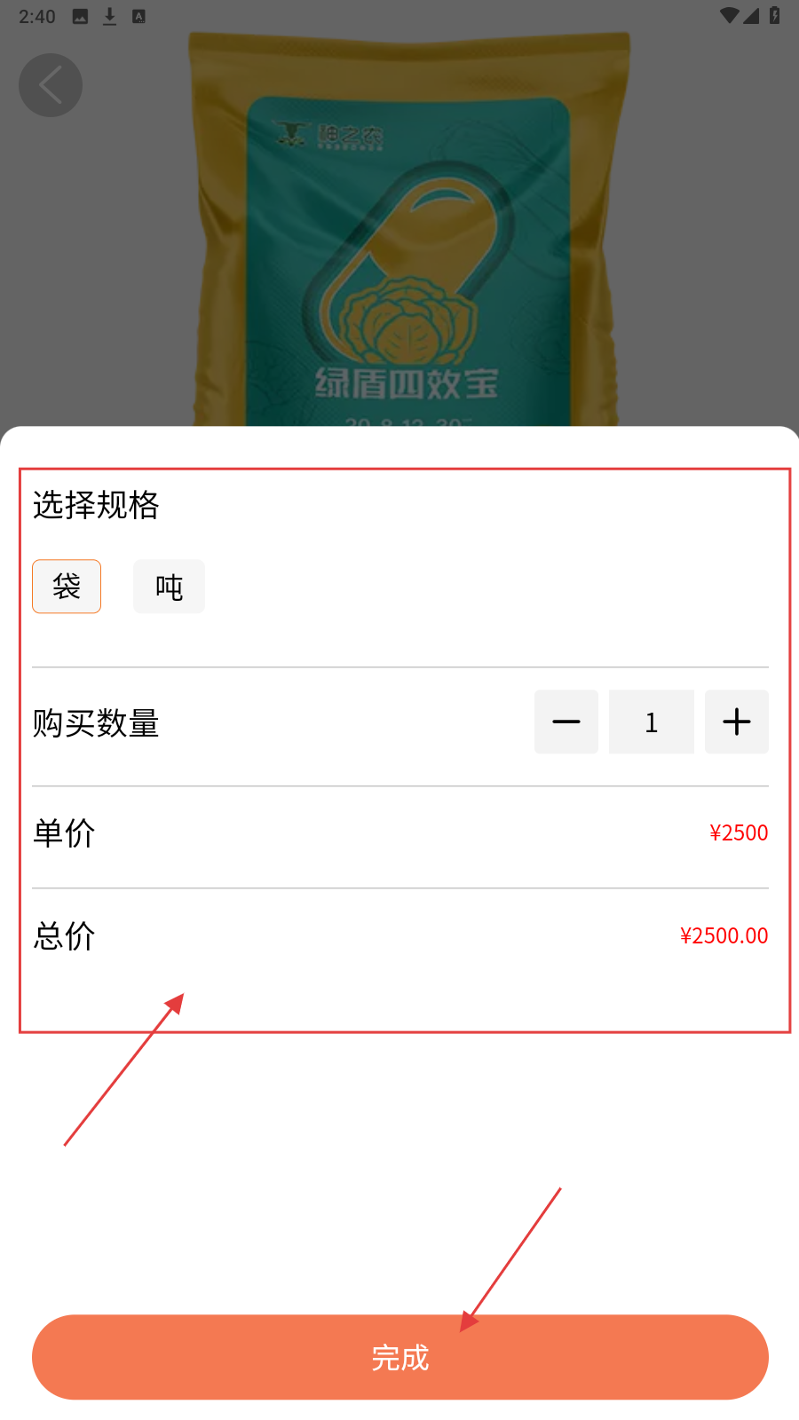 3、选规格(袋/吨)、填数量,点【完成】确认选购。