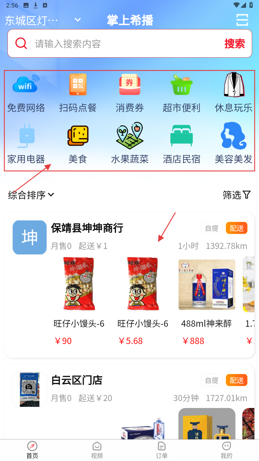 1、打开APP首页,选分类(如【家用电器),浏览商家与商品。