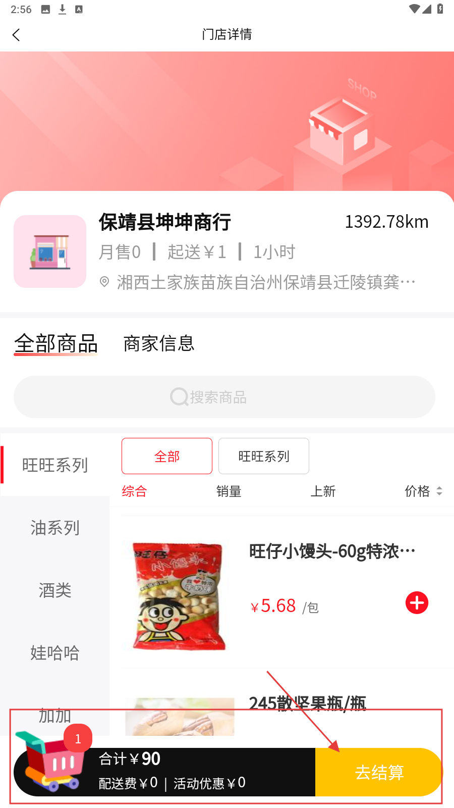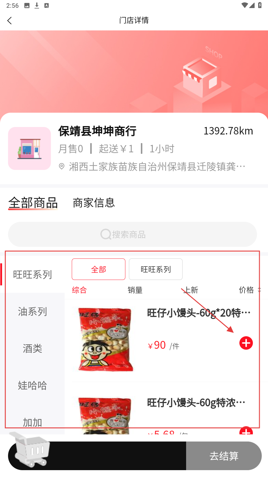 2、进入门店详情,选心仪商品(如旺仔小馒头),点【+】加购。