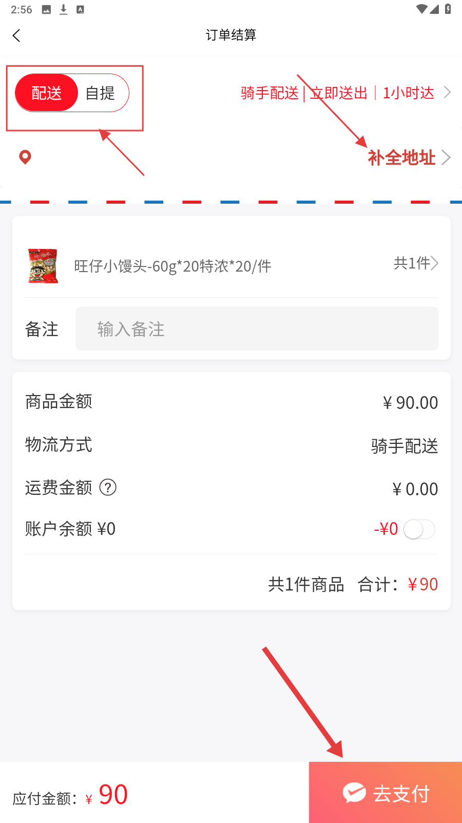 4、订单页选配送/自提、补地址,点【去支付】完成购买。