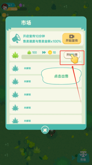 4、进入市场:点击“市场”按钮,开启宣传并出售收集到的树叶以换取金币。