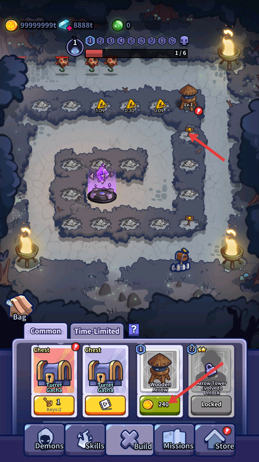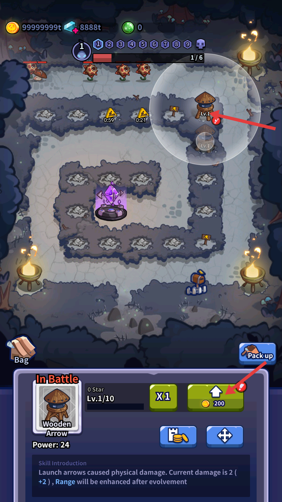 2、在战斗中选择合适的防御塔,如【WoodenArrow】,放置在合适的位置,抵御怪物的进攻。