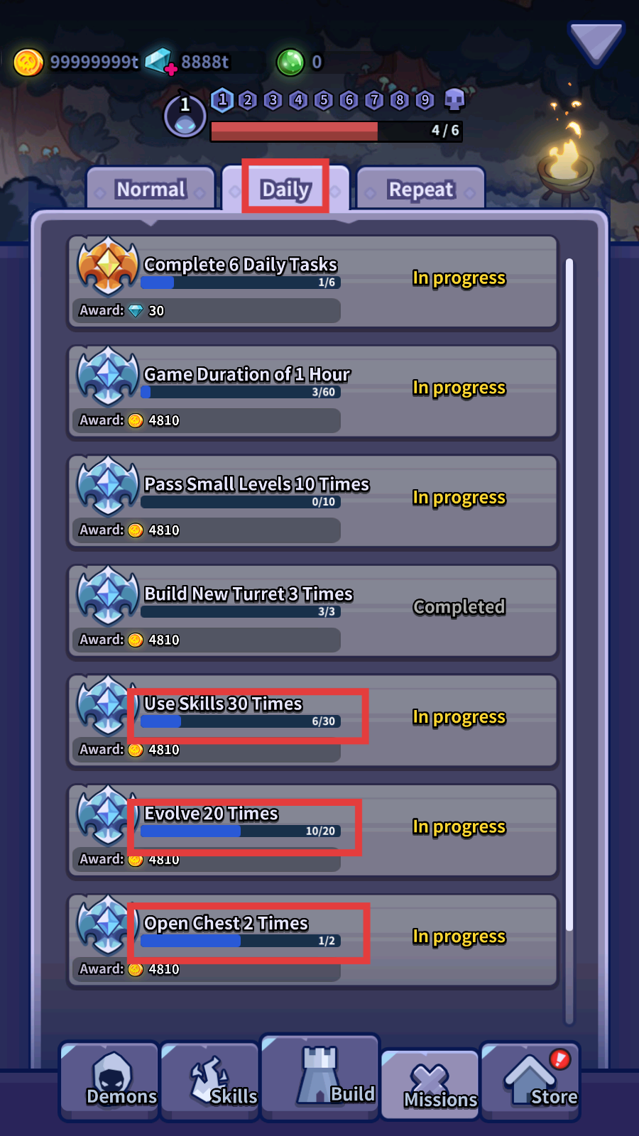 4、在任务界面,完成日常任务,如使用技能、进化防御塔和开启宝箱等,获取金币和钻石奖励,提升游戏进度。