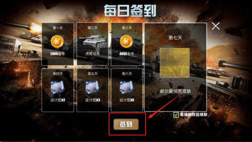 4、第七天再次点击签到,即可直接领取谢尔曼坦克皮肤与4000全币。