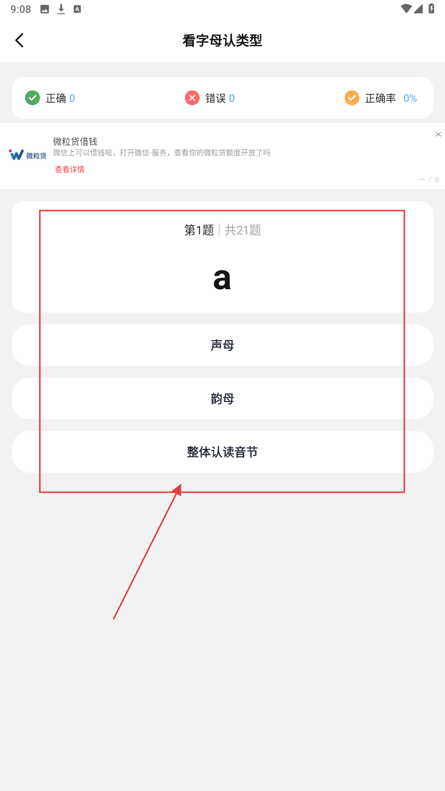 3、在【看字母认类型】页面,根据题目给出的字母,选择声母、韵母等,进行学习。