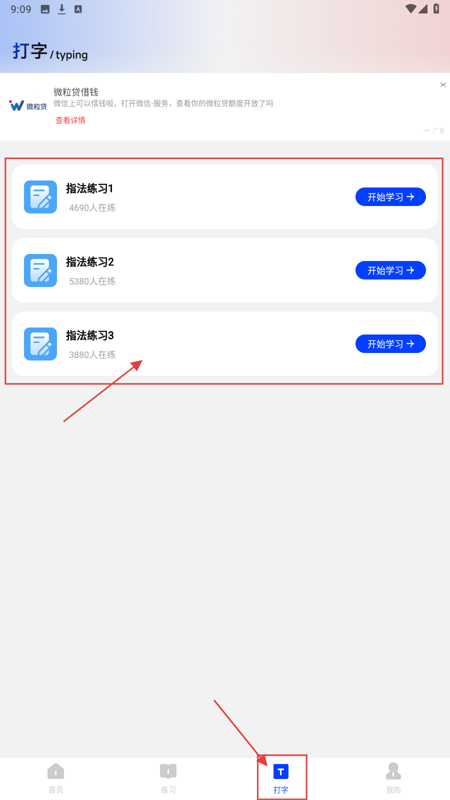 4、还可以点击底部【打字】按钮切换页面,进行打字练习。
