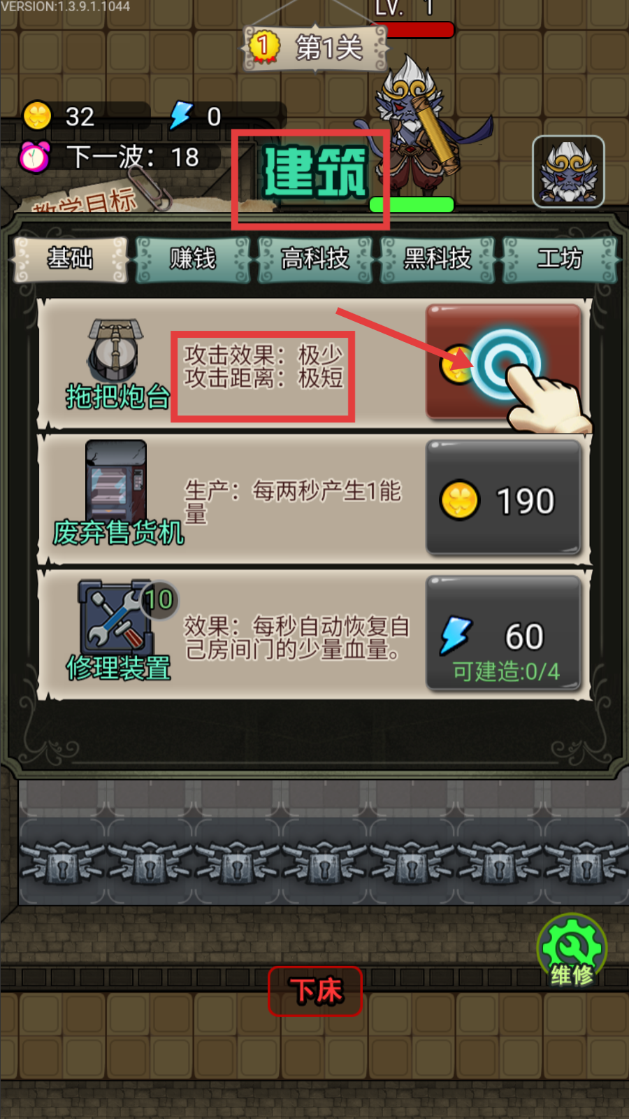 2、在【建筑】界面选【拖把炮台】,虽【攻击效果-极少】【攻击距离-极短】,但消耗低,优先建造助力防御。